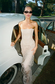 KYHA Gown, Heaven Mayhem Demi Fine Jewellery Collection, and Heaven Mayhem Esme Sunglasses in Tortoise